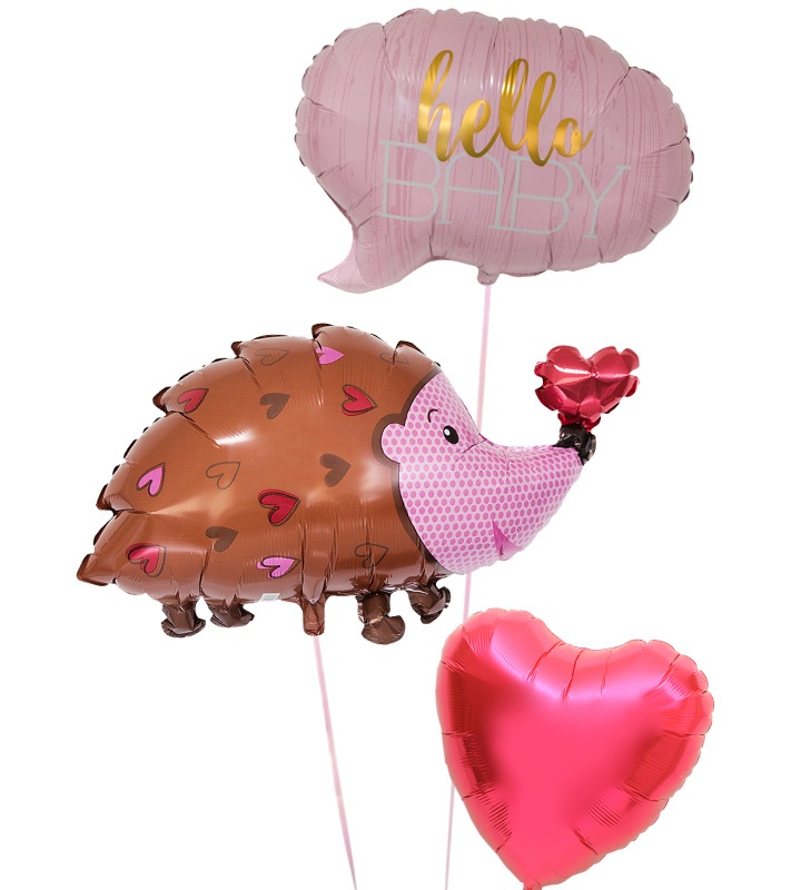 ハローベイビー(ピンク)とハートのハリネズミ、レッドハート【出産祝いのバルーン電報 女の子】