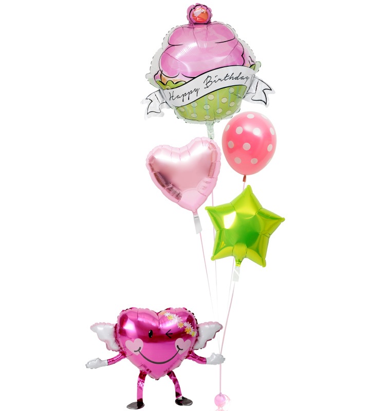 エンジェルちゃんが持つ、カップケーキとピンクドット、ピンクハート、ライムグリーンスター【誕生日のバルーン電報】