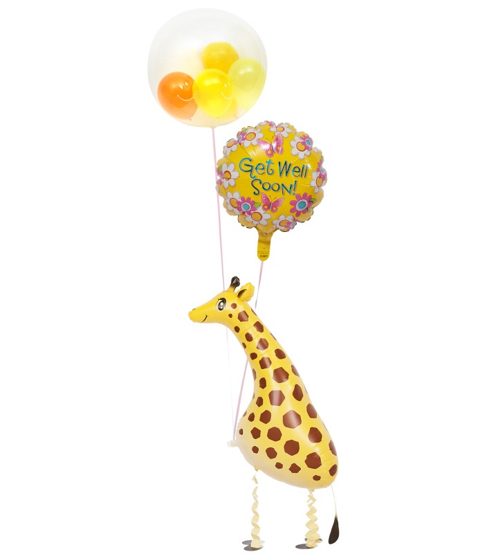 オレンジ系スマイルぷちバルーンとイエローフラワー、きりん【お見舞いのバルーン電報】