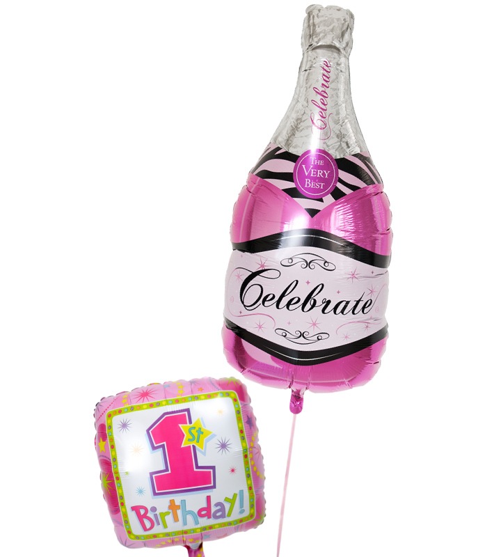 シャンパンでお祝いするファーストバースデー【1才の誕生日のバルーン電報・女の子】