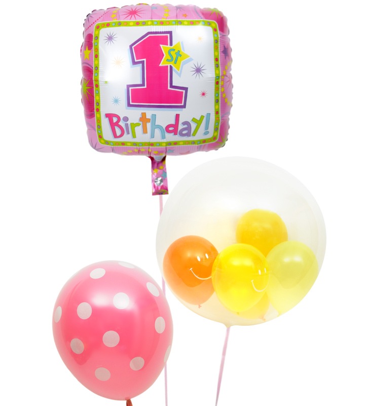 ぷちスマイルとピンクドットのファーストバースデー【1才の誕生日のバルーン電報・女の子】