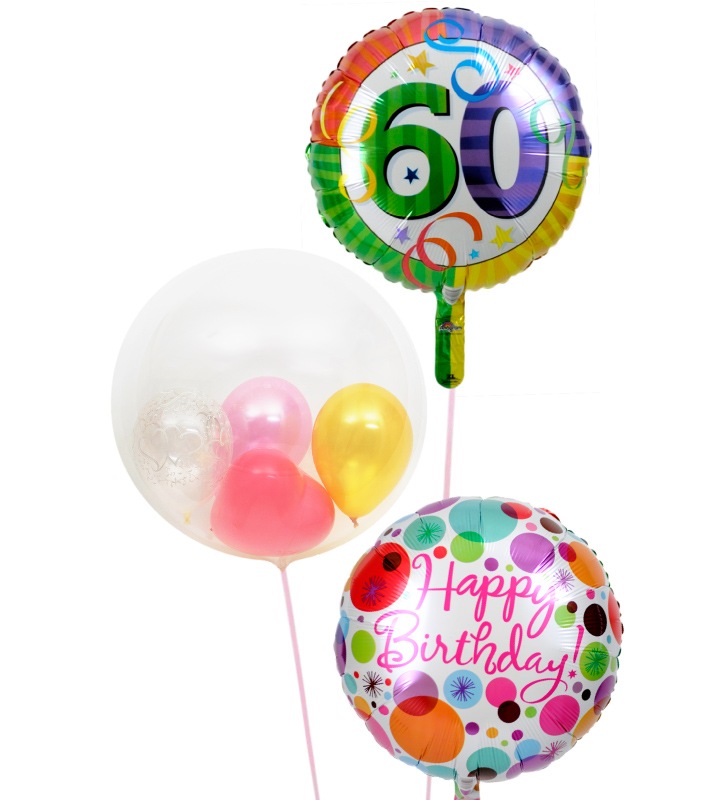60才バルーンとぷちハート、華やかドット【還暦祝いのバルーン電報】