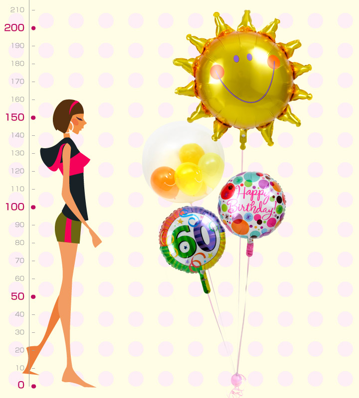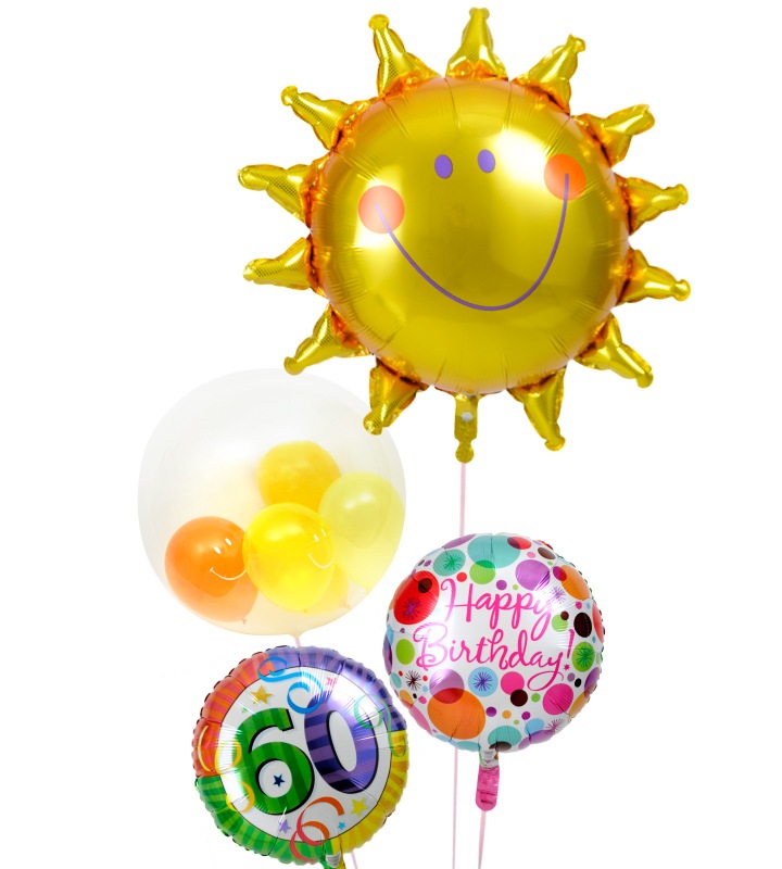 大きな太陽とぷちハート、華やかドット、60才バルーン【還暦祝いのバルーン電報】